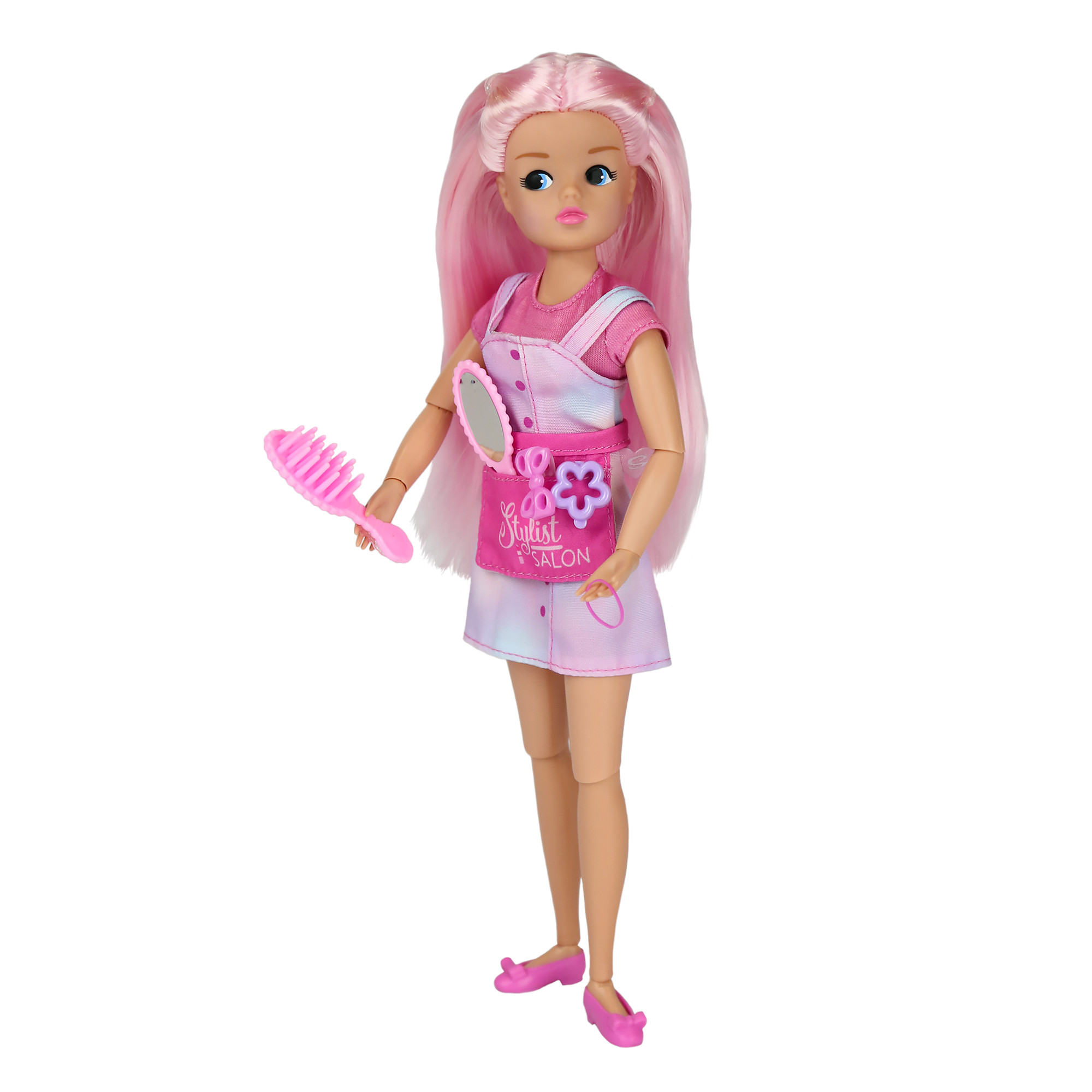 Salon Stylist Sindy is the perfect playset for any doll lover who just loves making new friends. She wears a bright pink tee, pastel tie dyed dress, bright pink ballet shoes and a pink accessories belt. She comes with super silky long pastel pink hair which she loves to try new styles with.